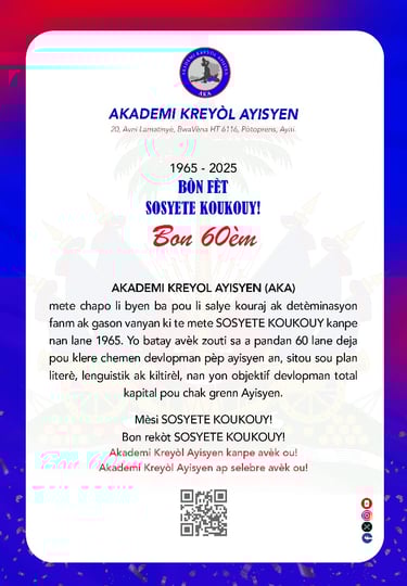 « Nan okazyon 10èm anivèsè li, Akademi Kreyòl Ayisyen ap prezante nou ‘100 Kesyon pou AKA’, yon liv kote n ap jwenn repons anpil kesyon nou abitye poze sou Akademi an ak sou lang Kreyòl ayisyen an. »